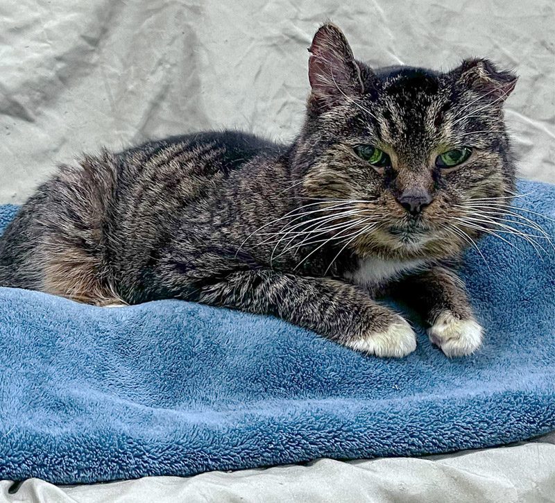 Arabella is estimated to have been born in 2010. She arrived here in 2011 and was then adopted out and returned a few months later because she was peeing all over the house. Arabella still does not always use the litter box and will most likely be with us for the remainder of her life. However, she is a very happy cat and loves to take time out for some lap time and to brighten up someone’s day when she can. She also is a favorite among our volunteers. In fact, one of Arabella’s all time favorite things to do is to sit and listen to someone read out loud to her. She is always right there and deeply engaged when people come to participate in our Purrfect Readers program and come into her room.