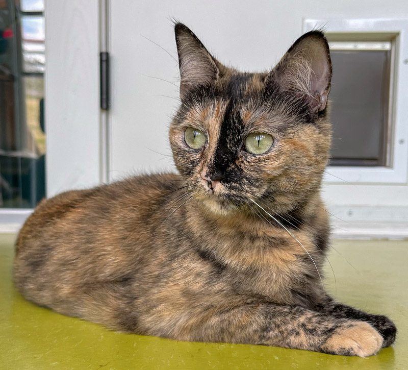 Delilah was born in August 2022 and was brought to the farm with her two littermates at just 2 weeks old. The litter was found abandoned under a porch and were all sick and malnourished. Delilah is super friendly and loves to run and flop down on the floor for attention. She also loves running and jumping off the back of furniture and playing with her friends. She is a ball of energy.