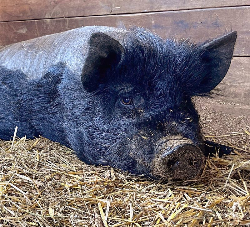 Elizabeth and her 5 siblings were born here in June of 2018 after their pregnant mother, Eloise, came to us from a horrific animal cruelty case. Eloise was severely traumatized but started to trust us and come out of her shell. When she delivered 6 piglets a month later, we knew we had to build a proper habitat for them where they could live out their days. All of them are wonderful friendly pigs who enjoy a good day out rooting in the sun, belly rubs, and of course, food.