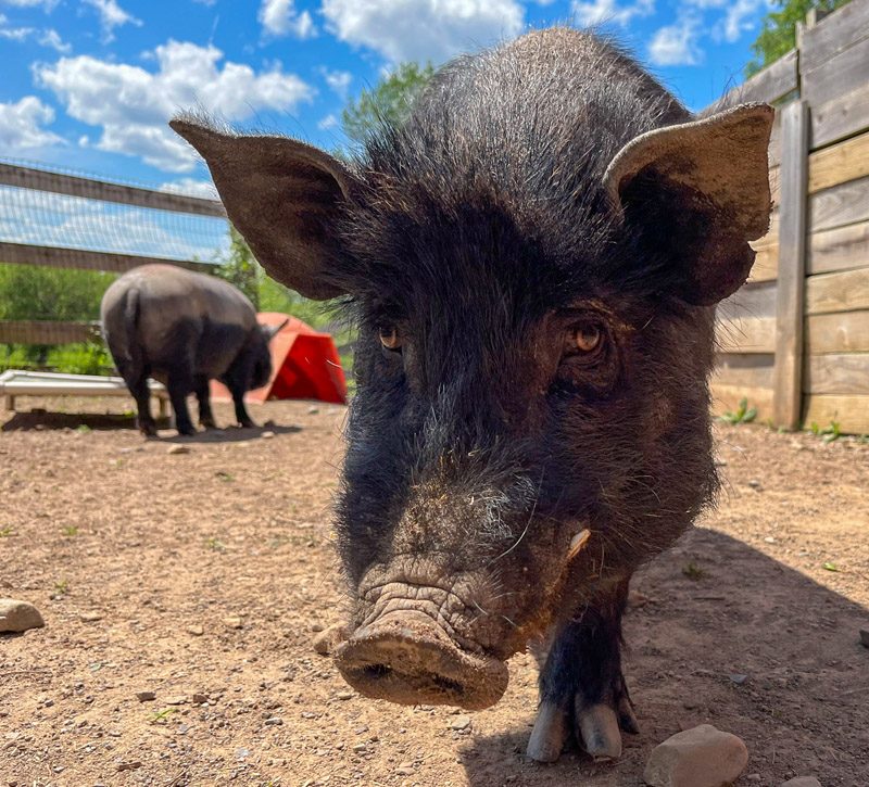 Esteban and his 5 siblings were born here in June of 2018 after their pregnant mother, Eloise, came to us from a horrific animal cruelty case. Eloise was severely traumatized but started to trust us and come out of her shell. When she delivered 6 piglets a month later, we knew we had to build a proper habitat for them where they could live out their days. All of them are wonderful friendly pigs who enjoy a good day out rooting in the sun, belly rubs, and of course, food.