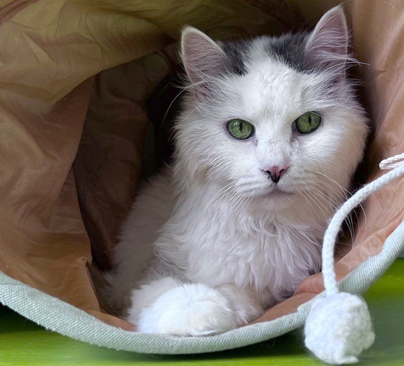 Fluff is estimated to have been born in 2010 and came to the farm in early 2025. Fluff suffered a devastating fate and was abandoned by his owner and left outside when that owner moved. A very caring neighbor saw him hanging around the house and noticed he was dreadfully matted. The kind neighbor tried and tried to get him help but couldn’t find anyone to help Fluff. We were able to step in to help through our Serenity Fund. When we got Fluff here and saw his horrible condition and discovered he was a senior cat he broke everyone’s hearts. It took hours of careful grooming to remove the largest mat that wrapped all the way around his body like a blanket. But Fluff was very patient and understood we were trying to help him. Fluff is an incredibly loving guy. He loves to purr and give kisses.