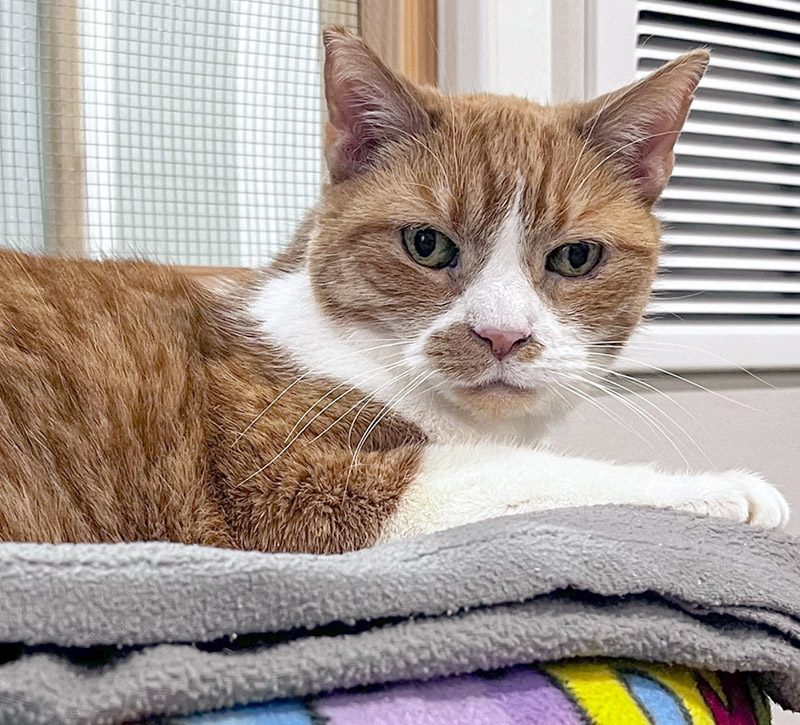 Goldie is estimated to have been born in 2007. She arrived at the farm in 2011 after her person died and there was no one able to take her in. Goldie is very skittish and pretty much likes to keep to herself. Even after living here for several years she prefers the company of her cat friends and being in her own space. Goldie will remain here at the sanctuary for the rest of her life.