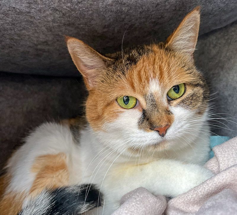 Heidi is estimated to have been born in 2016. She came to the farm in 2020 after she was found abandoned in an apartment. The people had moved out and left her behind. No one even knew she was in there until they were cleaning it out and found her hiding. Neighbors reported that she had been mistreated by the people who lived there. Heidi is incredibly shy. She spends most of her time hiding and we provide her with plenty of cubby holes and spaces for her to feel comfortable. She has been starting to come out for treats sometimes and will temporarily forget that she is supposed to be hiding. But then she darts away and hides again. She does love human attention and to be petted. This is also a difficult adjustment for her to live with other cats as she seemed to have been an only cat and she doesn’t quite know what to do with them. But we are letting her go at her own pace.