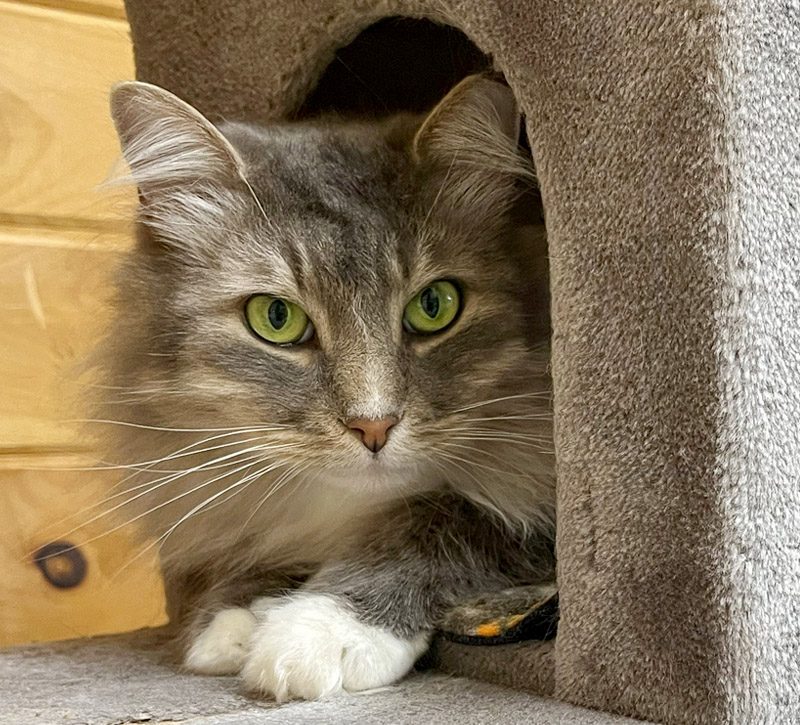 Liberty is estimated to have been born in fall of 2018 and came to the farm in June 2019. Liberty was found trying to survive in a warehouse in the city and was humanely trapped and brought to the farm when the warehouse was being emptied. Liberty is a feral cat but he is one that is adapting to being inside. At first, he hid all of the time and we just gave him his space to figure things out. All of a sudden one day, we observed him out in the room sitting with the other cats. He has been seen playing with toys and interacting with the other cats. Liberty is finding his way to a life that is meaningful to him. We are not putting any pressure or expectations on him for him to let us pet or handle him. We will give him the space to grow and define what parameters he is comfortable with in his life. And we are sure we will see this change as time goes on, but it will be on his terms and not on how we want his life to look for him.