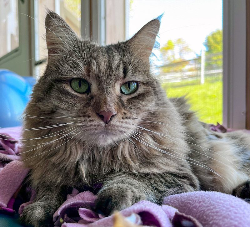 Louie was born in 2013 and came to the farm at just a few months old. She was adopted out soon after her arrival. The following year Louie was joined by three other cats Otis, Mia, and Bella who were also adopted from us. The four cats lived together until their person fell into hard times and they had to be returned in 2023. Louie was the shyest of the four cats when they first were returned. She spent her entire time hiding and running from one bed to the next and crawling under the cat beds or blankets to hide. But, a short time later, Louie suddenly acclimated and changed. Now, Louie is ready to greet people entering her room and feels much more comfortable being herself.