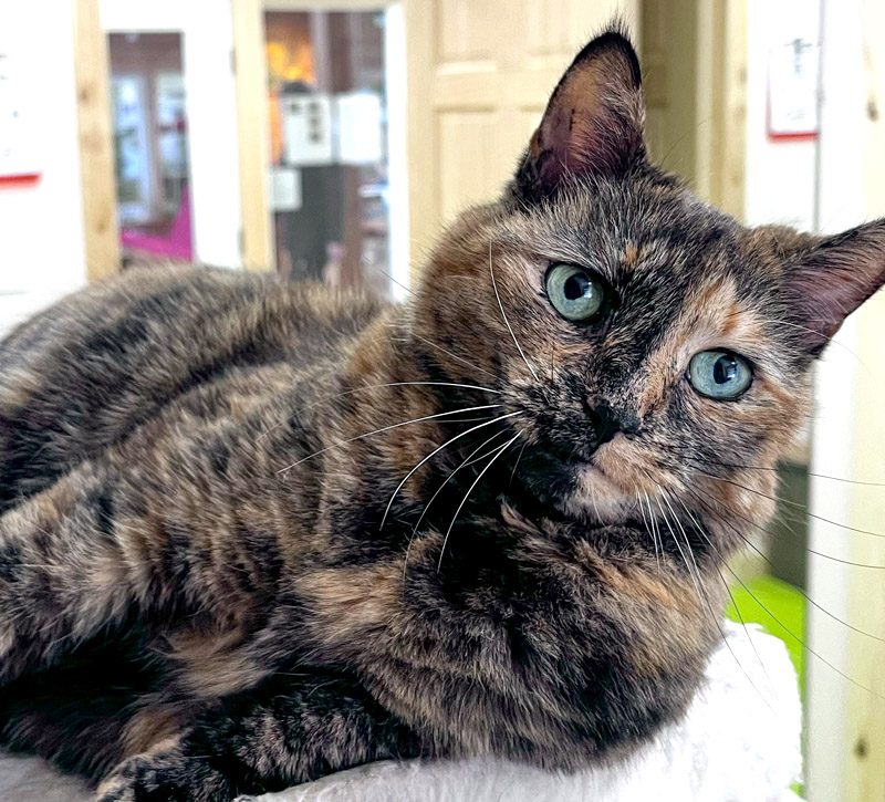 Mocha came to the farm in 2014 when she was just 1 week old. When she was old enough, she was adopted with her littermate sister Velvet. They stayed in that home together until in 2022 when sadly their person was put in a nursing home and no one could take in the cats. Velvet and Mocha were returned to us here. Both had a hard time adapting to the change. But they were very lucky to have a human friend, Bob, who knew them when they lived at their previous home. Bob stopped by to visit them every single day until they finally started to come out of hiding and trust us. They now are doing well here with us. And Bob continues to come and visit with them.