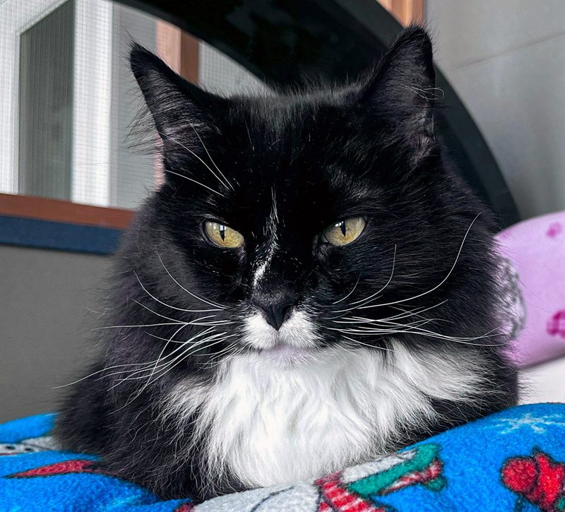 Ollie was born in 2016 and arrived at the farm in 2021. Ollie appeared on someone’s front porch covered in burdock. A neighbor said they saw him hanging around for about a month before. He has skin/hair loss issues and is on medication to try to keep it under control. Ollie can be very feisty. He often likes to pick fights with other cats. He lets people pet him about three times and then gives us a clear signal that enough is enough. There is one of his caretakers that he has chosen as his special person and Ollie will even sit on his lap.
