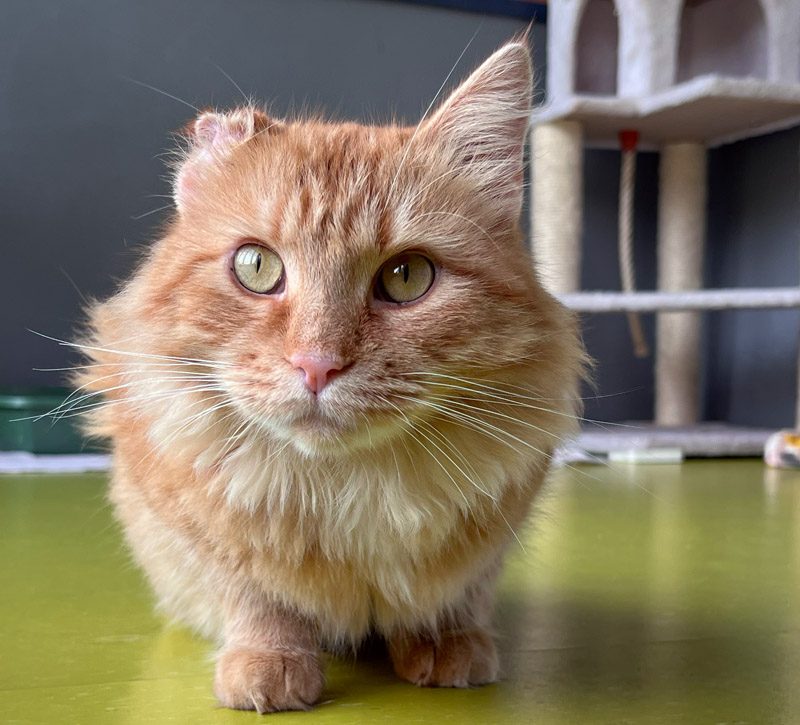 Ron came to the farm in summer of 2025 and is estimated to be about 2 years old. Ron showed up at a feral cat feeding station and was not in good shape. Besides being thin and ill, Ron has a deformed hind leg. We are not certain if it was a birth defect or if he suffered a traumatic injury but the end result is that it looks like that leg will need to be amputated. Ron was not fairing well at all living out on the streets. Life was really hard on him and when he first came in we were not sure how handleable he would be. But Ron settled in quickly and let us know how much love he had to share.