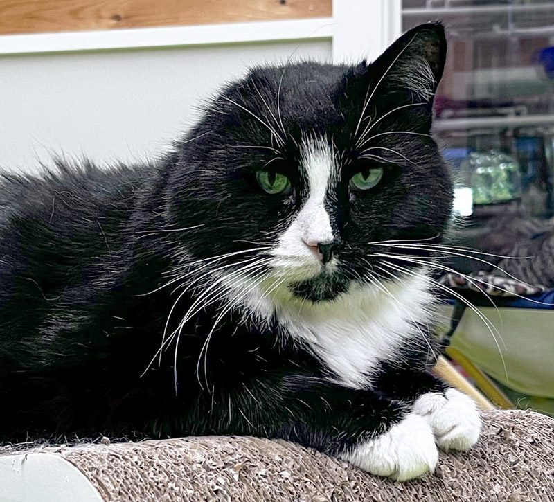 Rudy is estimated to have been born in 2012. He came to the farm in 2014 after he was found in our barn. It appeared someone had dumped him there. Rudy was pretty feral and is still very shy. He likes living with his other cat friends and doesn’t like to be pressured. We just let Rudy be Rudy and find his way. The interesting fact about Rudy is that although he is himself shy around humans, he has helped to socialize many kittens who have come through our facility. Kittens seem to gravitate to Rudy like a magnet. He has particularly been helpful to Dorian in becoming more trusting of humans. He is a happy guy and will explore the rest of his life here with us.