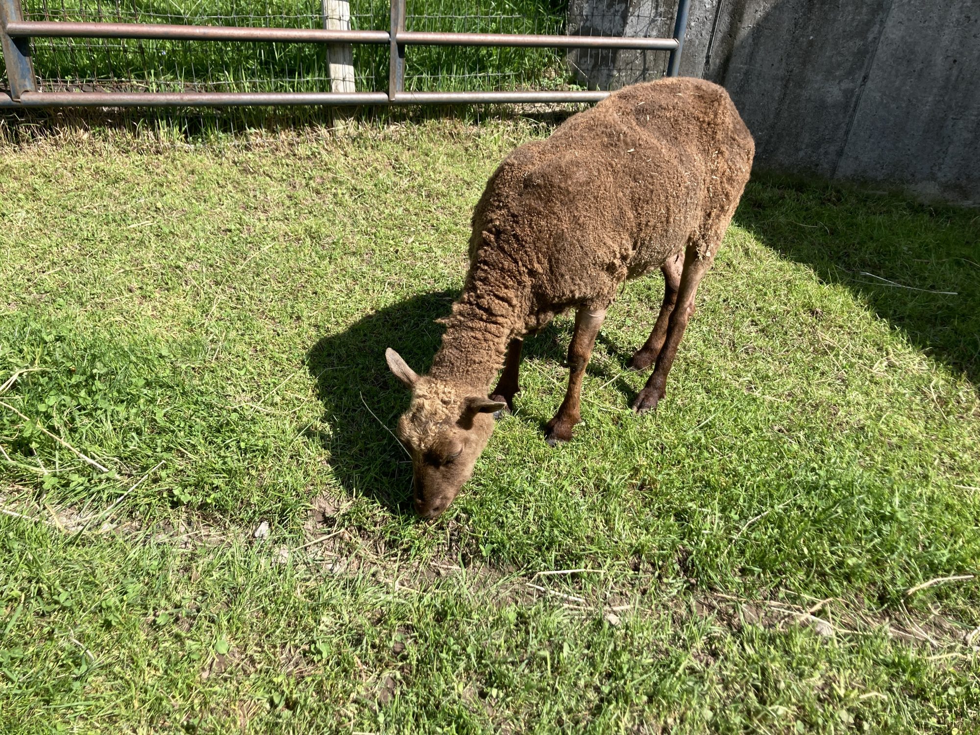 Mocha arrived in May 2025 with his buddy Hershey. Both of them came from a neglect situation and arrived very thin. We are just letting them settle in with their new sheep friend Mary and will update their bio’s when we know more about them.