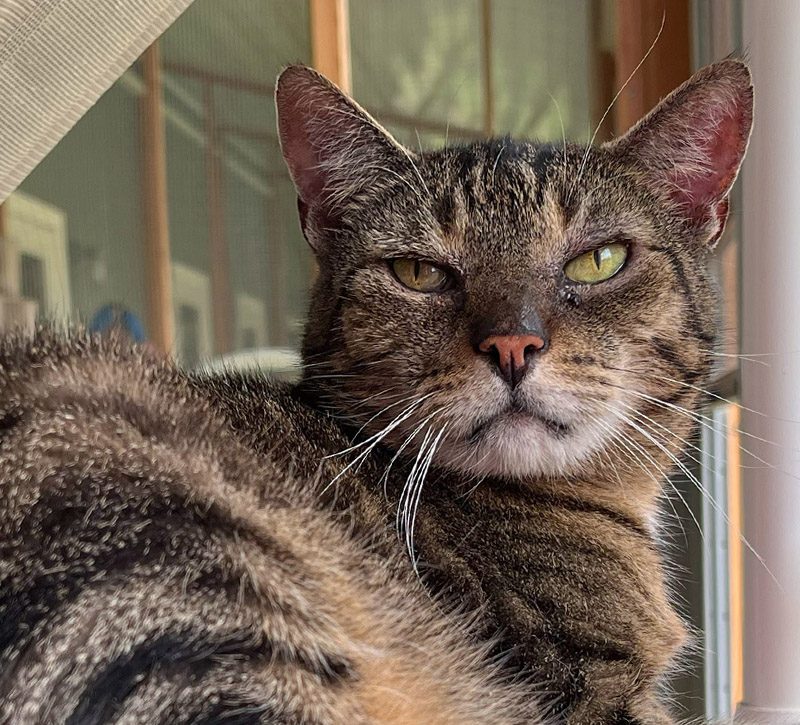 Tookey is estimated to have been born in 2009. She came to the farm in late 2023 with her cat friend Dat. Sadly, they lost their home after their person died. Tookey had a lot of trouble adjusting to her new surroundings. Dat adjusted far better and devoted himself to helping Tookey. We are all trying to help her but she is grieving the loss of her person and her home. It took time and patience but now Tookey has settled in to her new home.