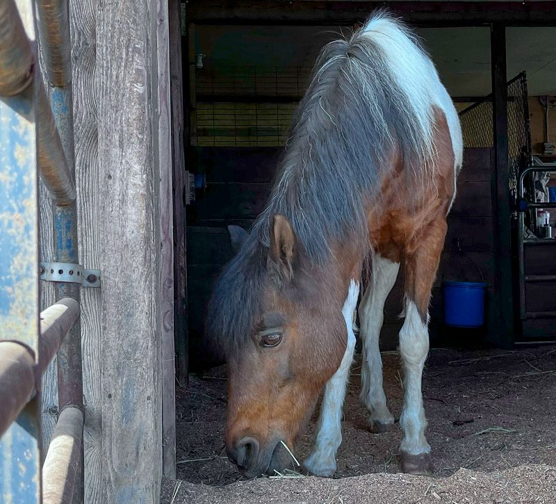 Tulip is a pony mare estimated to have been born in 2009 and came to the farm in August 2024. Tulip came from a large animal cruelty case where she lived in very poor conditions. She was left wandering without fences or barn of any sort and had a hard time finding food and needed care. She has seen a lot of terrible things. She came to us emaciated and also has Cushings Disease that was never treated. Tulip also has a large growth on her face that is believed to be a cyst that is not operable. She is now being treated for her Cushing’s Disease as well as getting the much needed care that she deserves. Tulip is slowly putting on weight and is very happy to be in a barn with other friends. She is now paired up with our pony Charlie and the two of them are very happy to be together. Tulip will receive everything she needs and the love that she deserves. We are happy to have her here with us.