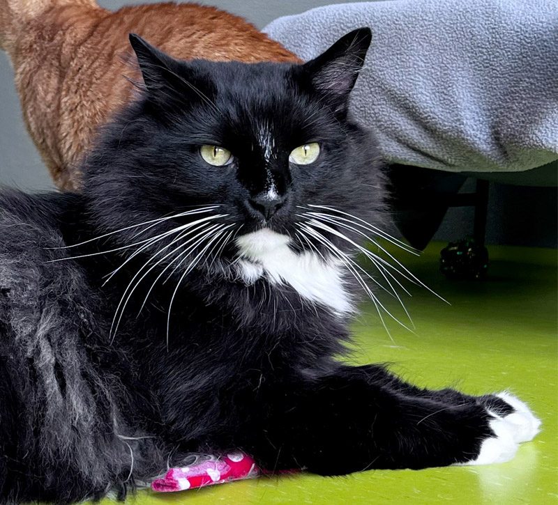 Varunie is estimated to have been born in 2015 and came to the farm in 2019 after he was found dumped on our property. Varunie loves to spend his days out on his enclosed porch. He meows to his caretakers to pet him and loves to have a good petting. Varunie is an individualist and likes to keep mostly to himself. He sometimes gets into quarrels with the other male cats in his room.