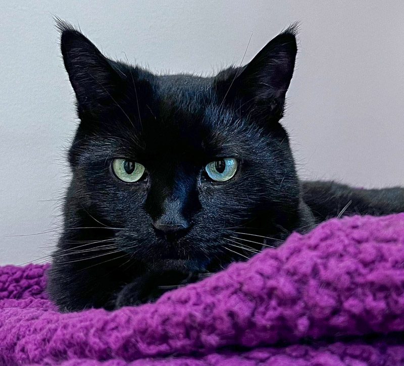 Velvet came to the farm in 2014 when she was just 1 week old. When she was old enough, she was adopted with her littermate sister Mocha. They stayed in that home together until in 2022 when sadly their person was put in a nursing home and no one could take in the cats. Velvet and Mocha were returned to us here. Both had a hard time adapting to the change. But they were very lucky to have a human friend, Bob, who knew them when they lived at their previous home. Bob stopped by to visit them every single day until they finally started to come out of hiding and trust us. They now are doing well here with us. And Bob continues to come and visit with them.