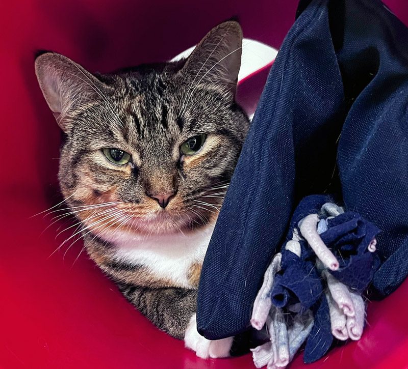 Victoria was born in August of 2022 and came to the farm with her littermates when she was just a couple of weeks old. They had been found under a porch and were sick and malnourished. Victoria is a bit skittish. She loves to run and play but she is hard to catch when we need to do anything with her. She does love catnip and she is crazy about co-founder/Director Bonnie who raised them since the day they came in.