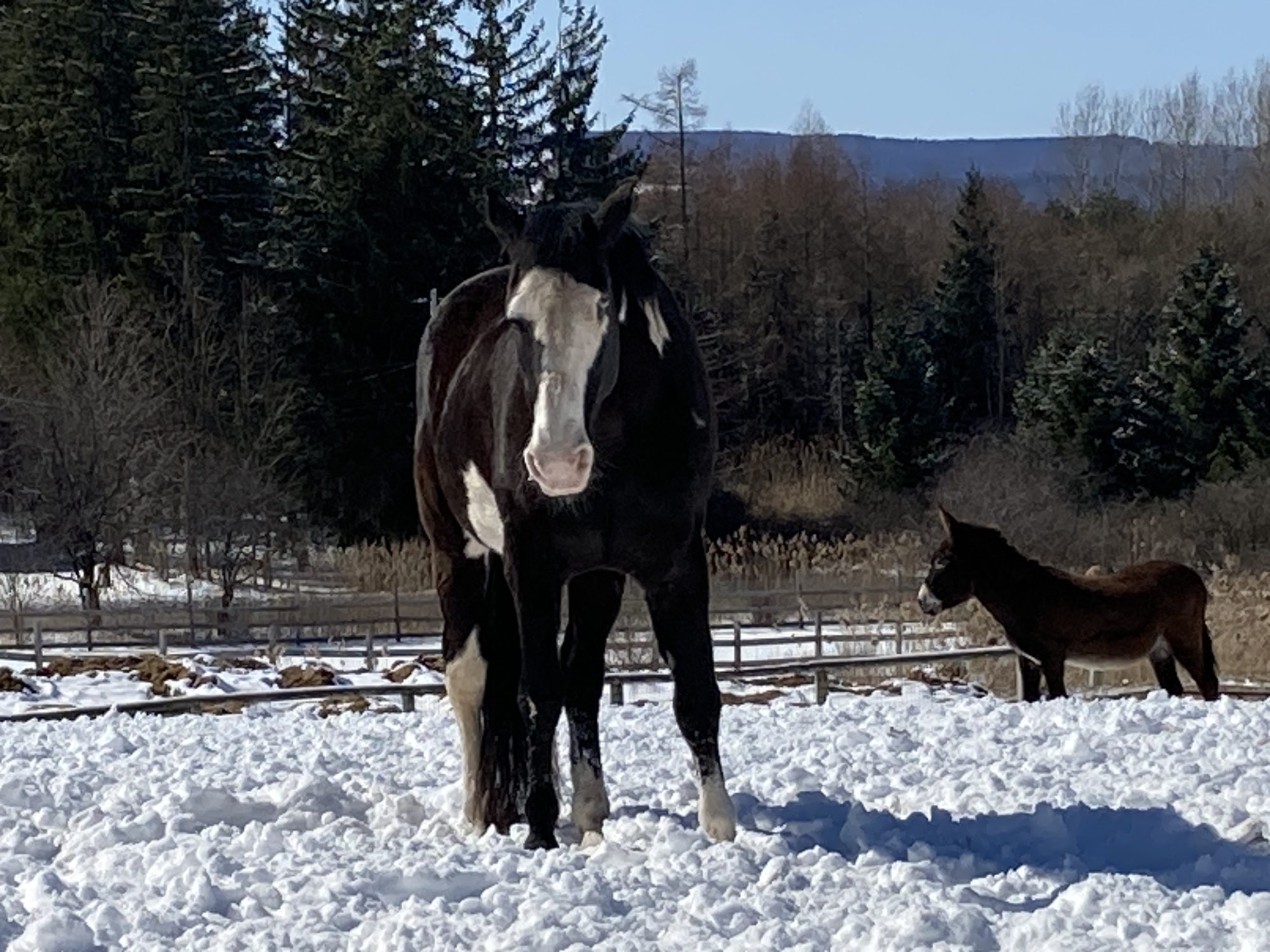 After getting over a foot of snow in yesterday’s spring snowstorm, today the horses and donkeys enjoyed going out on